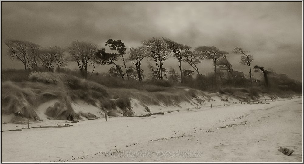 Bei dem unteren Bild am Weststrand bei Prerow am Darß war nicht das Wasser der mögliche Kamerakiller, sondern der enorme Sturm an dem Tag. Sturm an der See ist immer verbunden mit salziger Gischt in der Luft (also doch Wasser...) und jeder Menge umherfliegendem Sand. Ich kann schlecht beurteilen, was Deiner Kamera eher den Garaus beschert, Wasser oder Sand? Ich habe mir so beholfen, dass ich auf ein langes Einstellen verzichtete (die allseits belächelte Programmautomatik durfte werkeln), der Kamera zur Windseite mit meiner geöffneten Jacke etwas Windschutz gab (ja, ein Fotofan ist opferbereit, leidensfähig und friert gerne für seine Kamera), ansetzte und abdrückte. Fertig, Kamera wieder weg in die Jacke...