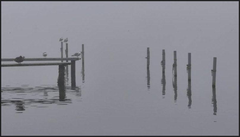 Bei Fotofan Lisas nachfolgendem Bild ist sogar noch weniger zu erkennen, was die Spannung im Motiv zusätzlich steigert. Solche Bildaussagen bekommst Du nur im Nebel hin. Stell Dir das Bild in der Sonne bei strahlend blauem Himmel vor, dann wäre ein “langweiliger” See zu sehen. Schön sind auch die Diagonalen, die auf einen nicht sichtbaren Punkt in der Ferne zulaufen. Auch bei Lisas Foto verschwinden die Farben und es bleibt ein bewusst trister, nebeliger Einheitsfarbton.