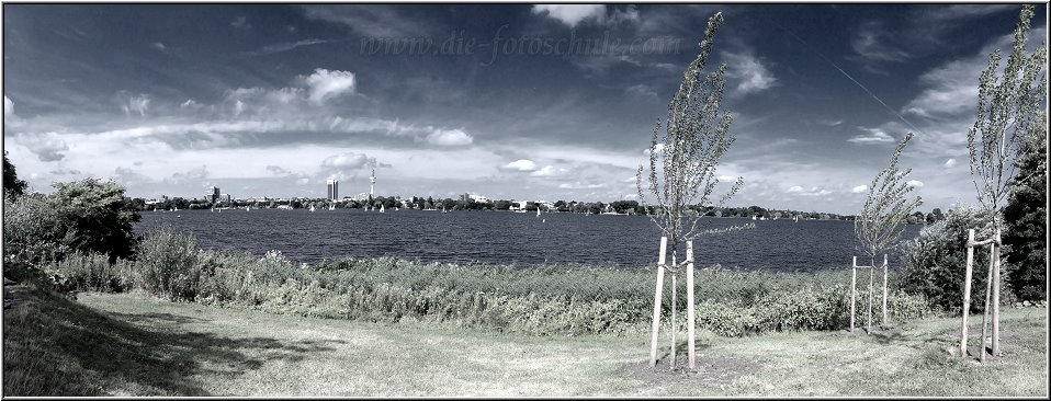 Am Südufer der Außenalster führt ein kombinierter Rad- und Wanderweg (getrennt) nahe am Wasser entlang und ermöglicht schöne Ausblicke, die geradezu für Panorama-Fotos gedacht sind. Das obere, wie auch das untere Foto entstanden mit der Panorama-Einstellung im iPhone. Wie viele Einzelfotos in der Kamera-App verarbeitet wurden, kann ich schwerlich sagen. Man schwenkt das iPhone entlang eines Pfeiles auf dem Display von links nach rechts und die Kamera fotografiert an gewissen Stellen automatisch. Das unterscheidet sich doch sehr von den eher manuell ausgelegten Abläufen mit der DSLR, oder Digicam.