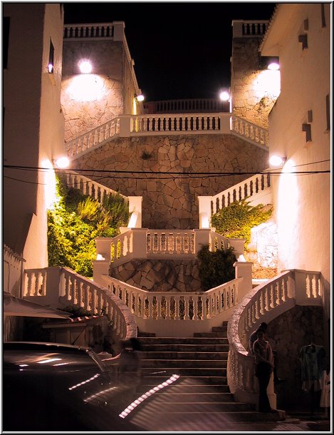 Auch bei diesem Foto geht es um die Bildwirkung bezogen auf Deinen Standort (wie auf dem Foto vom Hafen Es Castell). Diese beeindruckende Treppe führt in Mao von der Einkaufsstraße oben zur Hafenpromenade unten. Sie ist sehr steil und extravagant gemauert. Die vielen Stufen laufen immer wieder aufeinander zu, auch die Geländer sind sehr schön passend dazu entworfen. Diesen grandiosen Eindruck versuchst Du im Bild festzuhalten.
