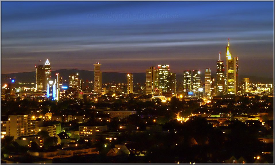 Hier geht es nicht um schöne Fotos von Wolkenkratzern am sonnigen Nachmittag, sondern eher um das atemberaubende Feeling dieser Kolosse bei einsetzender Nacht. Aus der Ferne betrachtet ist so ein Anblick echt überwältigend, wenn unzählige Lichter Dein ganzes Panorama in eine unwirkliche Stimmung tauchen. Hinzu kommen der dunkelblaue Himmel und das dazu passende Wolkenspiel. Ob nun ein Hochhaus, oder wie am Beispiel von Frankfurt, ganze Hochhaus-Kolonien “schön” sind, lassen wir mal außen vor. Wer meine Digital-Fotogalerie durchstöbert hat, wird sicher erfahren haben, dass es mich schon eher zu einsamen Stränden, als in hessische Betonwüsten zieht. Es wäre aber auch gelogen, wenn ich behaupten würde, dass mich das Bild der Skyline by night beim Blick vom Hotelbalkon kalt lassen würde.