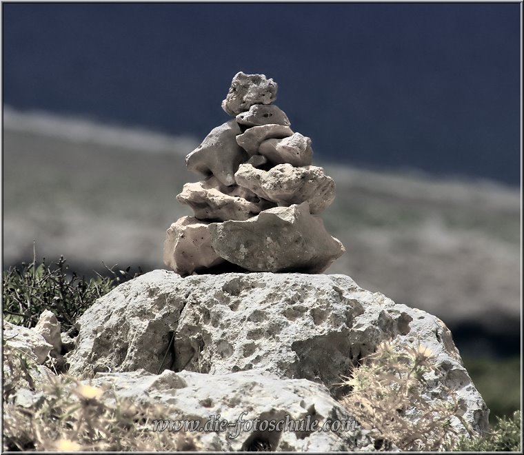 Aus der Fotoserie Tramuntana azul, entstanden am Cap de Cavalleria im Norden Menorcas Einstellung: Tele-Zoom auf 270mm (entspricht 420mm Kleinbild-Tele), ISO 100. 1/500 Sekunden mit offener Blende f6.3 Hier kannst Du sehr gut sehen, wie sich der gezielte Einsatz der Schärfentiefensteuerung auf Dein Foto auswirkt. Das Steintürmchen liegt im Bereich der höchsten Schärfe, während das Meer und der Strand im Hintergrund in diffuser Unschärfe verschwinden. Für solche Fotos solltest Du möglichst mit offener Blende und Teleeinstellung am Zoom arbeiten.