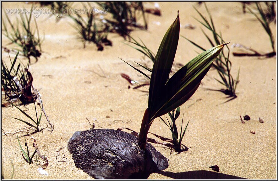 Aus der Fotoserie Karibik, entstanden an der Playa Bonita auf Samana Ein Detail des Palmenstrandes kann auch Geschichten erzählen, es muss und sollte nicht immer nur die klassische Totalansicht sein. Die Belichtungsdaten weiß ich nicht mehr, das Bild ist im letzten Jahrtausend auf Diafilm mit SLR und leichtem Tele entstanden.
