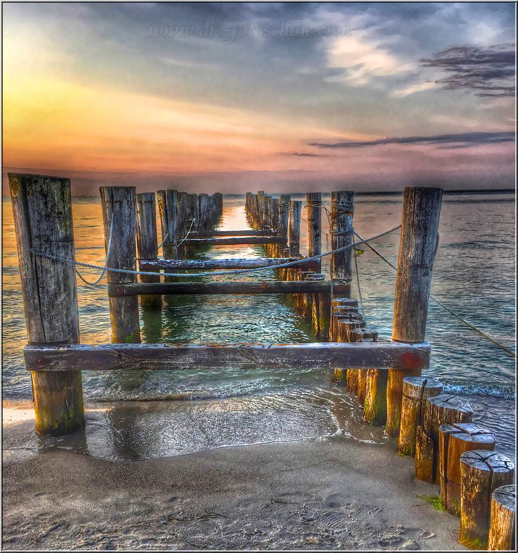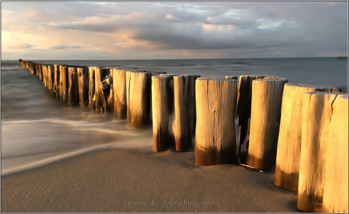 Auch hier ist es eher das Spiel mit der Schärfe und eine gewollte Unschärfe im Foto, die das Bild ausmacht. Durch die Wahl der offenen Blende verringert sich die Schärfentiefe und die Pollerreihe verläuft zum Horizont hin ins Unscharfe. Der Einsatz einer langen Verschlusszeit lässt zusätzlich die Wellen und das Meer im Vordergrund weich verwischen. Normal belichtet mit durchgängiger Schärfe wäre das Bild recht langweilig und alltäglich geworden. Damit das alles möglich wurde, offene Blende und 3 sec. Verschlusszeit, kam ein Graufilter vor´s Objektiv.