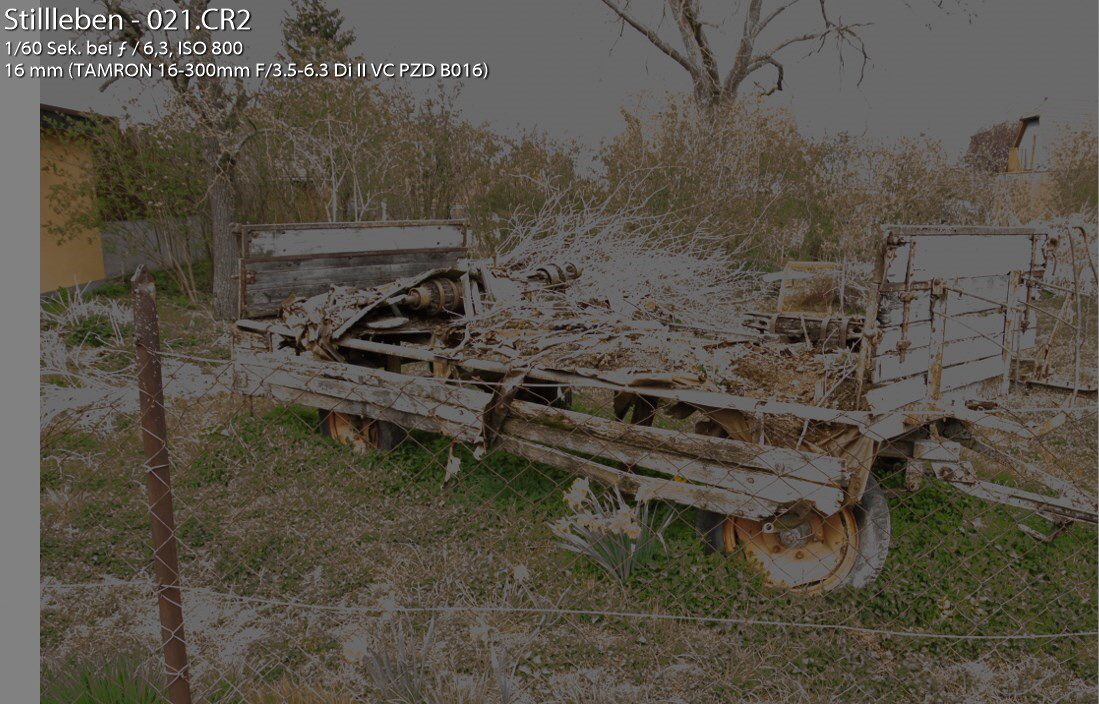 Was die Überbelichtungen seiner Fotos angeht, ist das Ergebnis zu erwarten, da die eingestellten Werte gleich um mehrere Blendenstufen (Lichtwerte oder auch EV) zu hoch umgerechnet sind. Grob überschlagen, sind das 8 Blendenstufen Überbelichtung bei dem Foto Nr. 018 mit dem ISO 3200 Wert. Selbst ohne den ISO-Wert anzupassen, wären es noch zwei Blendenstufen (angepasst bezogen auf die etwas größere Blendenöffnung). Auch die anderen beiden eingestellten Werte driften Günther in eine totale Überbelichtung ab: 1/30, f 5,6, ISO 1600 bzw. 1/60, f 6,3, ISO 800. Mal abgesehen davon, dass Günther auch hier zwischen 5 bzw 3,5 Blendenstufen überbelichtet hat, bringt ihm die Blende f5.6 zu f5.6 bzw. f5.6 zu f6.3 rein gar nichts hinsichtlich einer Verkleinerung des Schärfentiefenbereiches. Darum hat er ja die manuelle Einstellung der automatischen Belichtungswahl der Kamera vorgezogen, um den Karren von dem Gitterzaun freizustellen; durch eine gewünschte geringere Schärfentiefe.