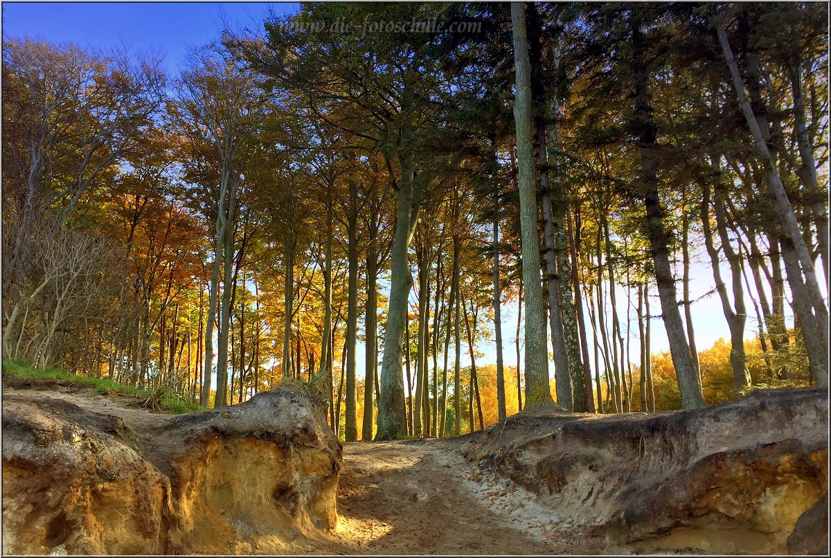 Den AWB schalte besser aus und wähle eine feste Einstellung. Ideal ist den Weißabgleich auf Sonnenlicht zu stellen. Fotografierst Du nicht zur Mittagszeit, sondern in den Morgen- bzw. Abendstunden, hilft Dir das den nunmehr gewollten Farbstich (das warme rötlich gelbe) auch aufs Foto zu bekommen. Du solltest aber auch erwägen, trotz all der Nachteile den hohen Sonnenstand der Mittagszeit zu nutzen. Bei einem hohen Sonnenstand zur Mittagszeit kannst Du das Blätter- oder Nadeldach Deines Waldes im Sonnenlicht frisch grün glänzen lassen. Achte dann nur auf die Belichtung, dass nicht alles im Schatten ersäuft, wenn die Kamera Dir “falsche” Werte vorgibt. Auch einzeln beleuchtete Details, Lichtstreifen und helle neben dunklen unbeleuchteten Bereichen des Waldbodens kannst Du so gut fotografieren. Das klappt natürlich auch und noch besser zur Goldenen Stunde. Vorausgesetzt, Dein Wald ist lichte genug, sonst kommt bei schräg stehender Sonne nichts mehr durch die Baumreihen durch.
