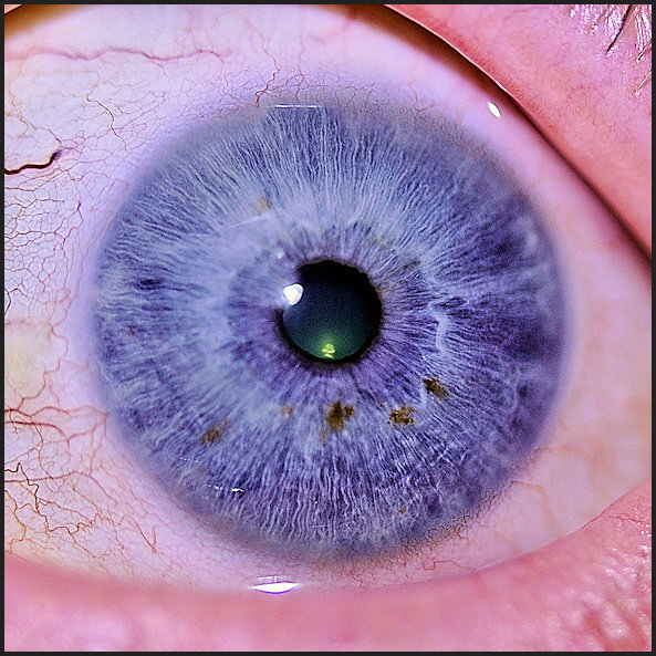 Neben den Tipps von Fotofan Klaus, möglichst reflexionsfrei zu fotografieren (keine Lichtquellen im Raum und wenn dann hinter dem Modell), einen schwarzen Karton für den Kopf zu basteln und eine feste Kopfablage (Auflage-Abstützung des Kinns und ggf. der Stirn) einzusetzen, die Augenlider mit den Fingern aufzuhalten und Serienfotos zu schießen, muss Dein Foto für einen Ausdruck entsprechend hochauflösend und scharf sein. Natürlich wirst Du dann sofort zu Deiner DSLR greifen, denn die hat den besten Sensor (Systemkameras, DSLM etc. wie immer selbstverständlich vergleichbar). Der größere Body Deiner DSLR, der Dir sonst viele Vorteile bietet, wird bei der Iris-Fotografie jedoch schnell zum Nachteil. Mit Deinem Makro-Objektiv oder Zwischenringen davor bekommst Du Probleme, den Blitz-Reflex genau in die Pupille und nicht störend auf der Iris zu haben. Das gilt für den aufgesetzten Zusatzblitz, den Aufklapp-Kamerablitz und einen irgendwo daneben platzierten Systemblitz. Du wirst dann auf diffuses helles Raumlicht oder alternative Lichtquellen ausweichen müssen, beispielsweise so, wie es Klaus umsetzte.
