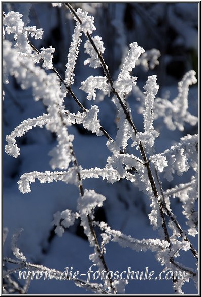 Dieses Foto aus meiner Fotoserie Winterlandschaften entstand mit manuell zusätzlich aktiviertem externen Blitz. So konnte ich die dunklen Bereiche der Schneekristalle aufhellen und die Äste zusätzlich zur Sonne noch mehr zum Strahlen bringen.