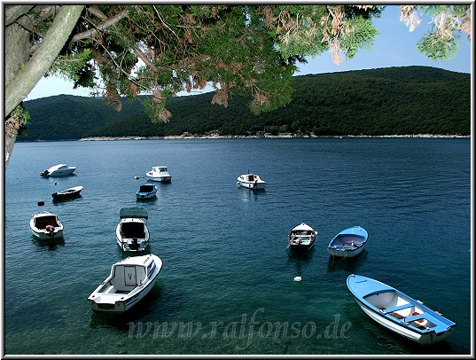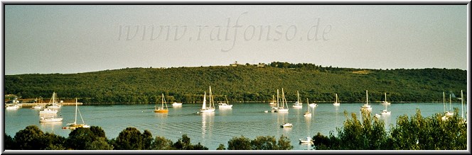 Da hat sich nichts geändert, genauso kann ich es nun wieder schreiben. In meinem Urlaubsort Banjole, einem kleinen Ort unterhalb von Pula an dem südlichsten Zipfel Istriens, hatte ich das große Glück, ein Ferienhaus zu bewohnen, von dem ich einen herrlichen Blick auf die Hafenbucht hatte. Die Segelschiffe lagen wie weiße Flecken auf dem tiefblauen Wasser, das von dem Grün der angrenzenden bis ans Meer reichenden Pinienwälder eingerahmt wurde. Ich habe es genossen, dazusitzen und dem gemächlichen Treiben dort zuzuschauen. Zahlreiche solcher Buchten gibt es rund um Banjole und Premantura.