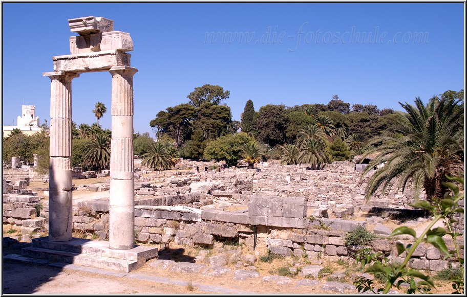 Unser Ausflug führte von Tigaki als erste Station durch das Dorf Platani zum Asklipion. Es ist nicht ganz einfach zwischen den Reisebussen einen Parkplatz für den weißen Chevi zu finden. Das Asklipion ist das antike Heiligtum für den Gott der Heilkunst und war so etwas wie ein Krankenhaus oder eine Notarztstation. Davon zu sehen sind einige Säulen und drei riesige Terrassen, die eine schöne Aussicht aufs weit unten liegende Meer bieten. Freunde historischer Ausgrabungsstätten kommen hier voll auf ihre Kosten. Allerdings kostet das Asklipion 4,-- EUR Eintritt, bietet keinen Schatten und ist sehr überfüllt.