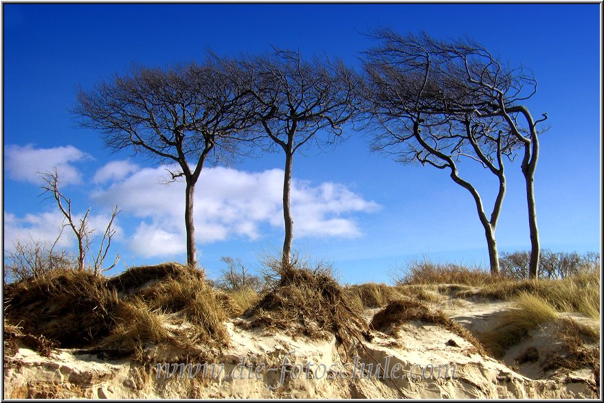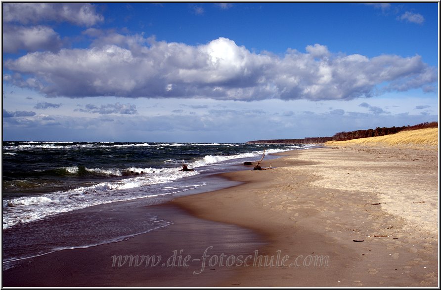 Am Weststrand trifft die Ostsee besonders hart auf´s Land und trägt fortwährend Stücke vom Strand ab, um sie im Norden wieder anzuspülen. So entstehen schroffe Küstenabschnitte, denn nach und nach wandert die Küstenlinie weiter in den Darßer Wald hinein, unterhöhlt die Bäume und läßt sie umstürzen. Am Strand liegend verwittern sie allmählich und zurück bleiben einzelne Stämme und bizarre Wurzeln, die mit dem blauen Meer und weißem feinen Sand ein harmonisches Gesamtbild ergeben. Angefangen von Ahrenshoop am südwestlichen Ende des Darßer Wald bis hoch zum weithin sichtbaren Ende des Weststrandes kann man herrlich am Strand entlang schlendern und die zerfurchten Windflüchter am Waldrand betrachten, die herrlichen Wellen geniessen und den oft deutlich spürbaren Wind in den Haaren toben lassen. An vielen Tagen war ich fast alleine hier, nur vereinzelt traf ich andere "Strandläufer" und so suche ich nun nach den passenden Worten, meine Eindrücke von diesem einsamen, rauhen und wunderschönen Strand zu beschreiben....